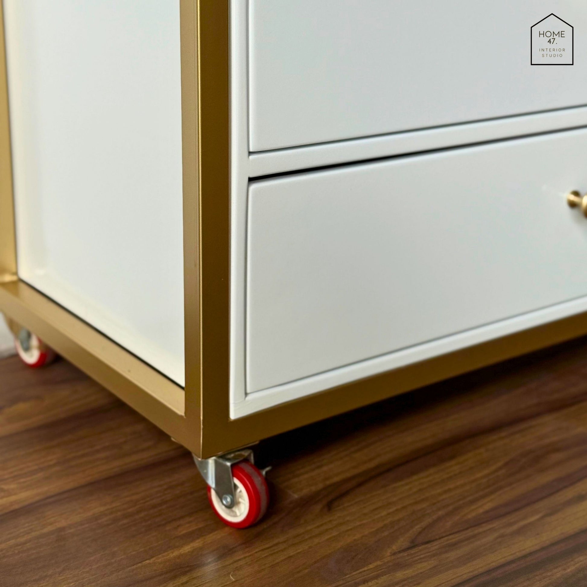 Elevate your bedroom with this stunning white and gold clothing rack that's as functional as it is beautiful. Featuring a sleek canopy frame perfect for hanging your favorite pieces, plus four spacious drawers to keep your essentials organized and out of sight. The luxe gold accents and smooth-rolling wheels add both elegance and practicality to your space.