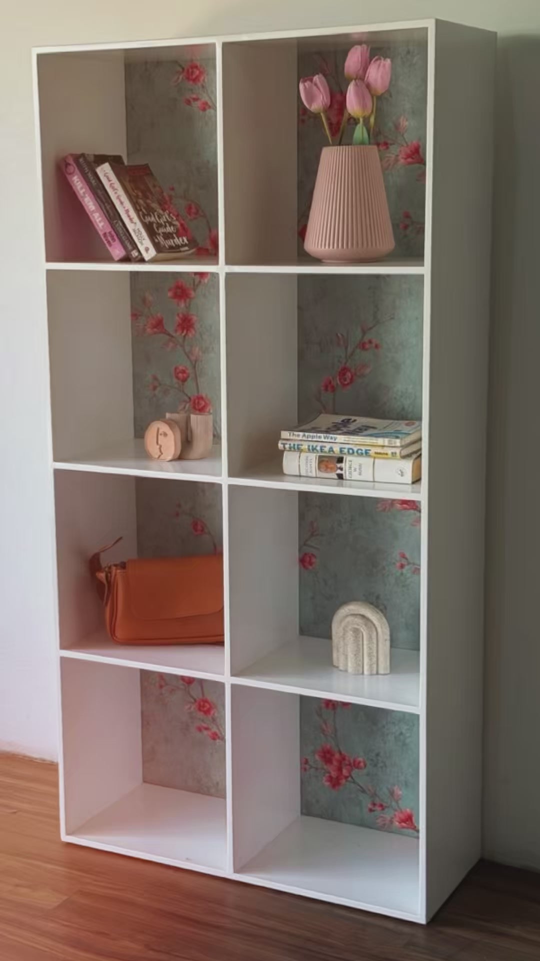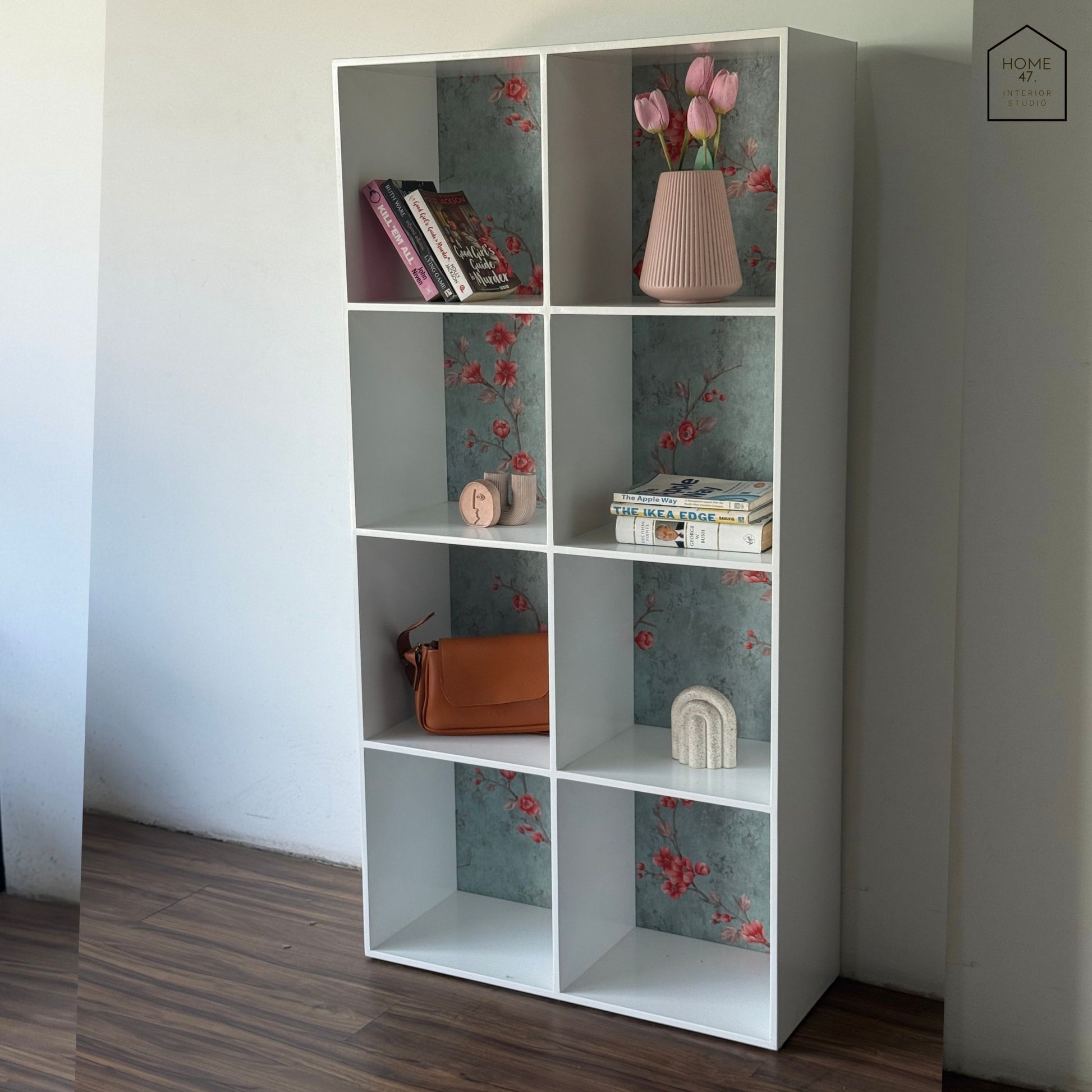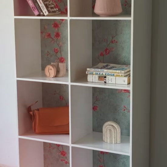 Featuring a beautifully curated floral back panel, this variant blends modern utility with a vintage botanical aesthetic. The delicate cherry blossom motif against a serene, muted teal backdrop creates a "shadow box" effect, making every book, ceramic, or photo frame you display look like a piece of curated art.