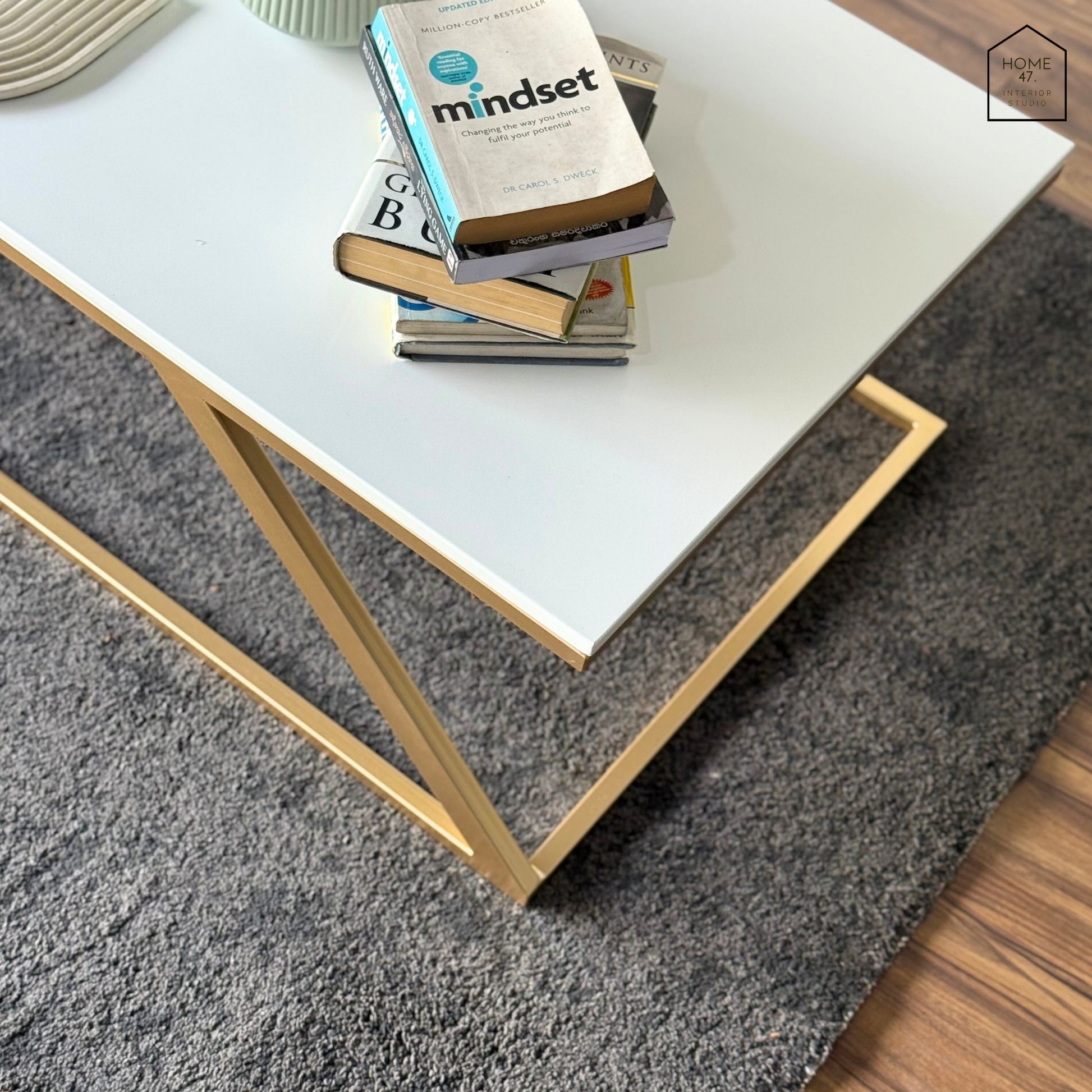 The geometric Z-frame base is crafted from brushed gold powder-coated steel, angular, dynamic, and engineered to turn heads from every angle. Side-on, it reads like a lightning bolt. Front-on, it frames the room like a piece of sculpture. The gold tone catches light throughout the day, giving the table a different quality of presence in morning light versus evening lamplight.